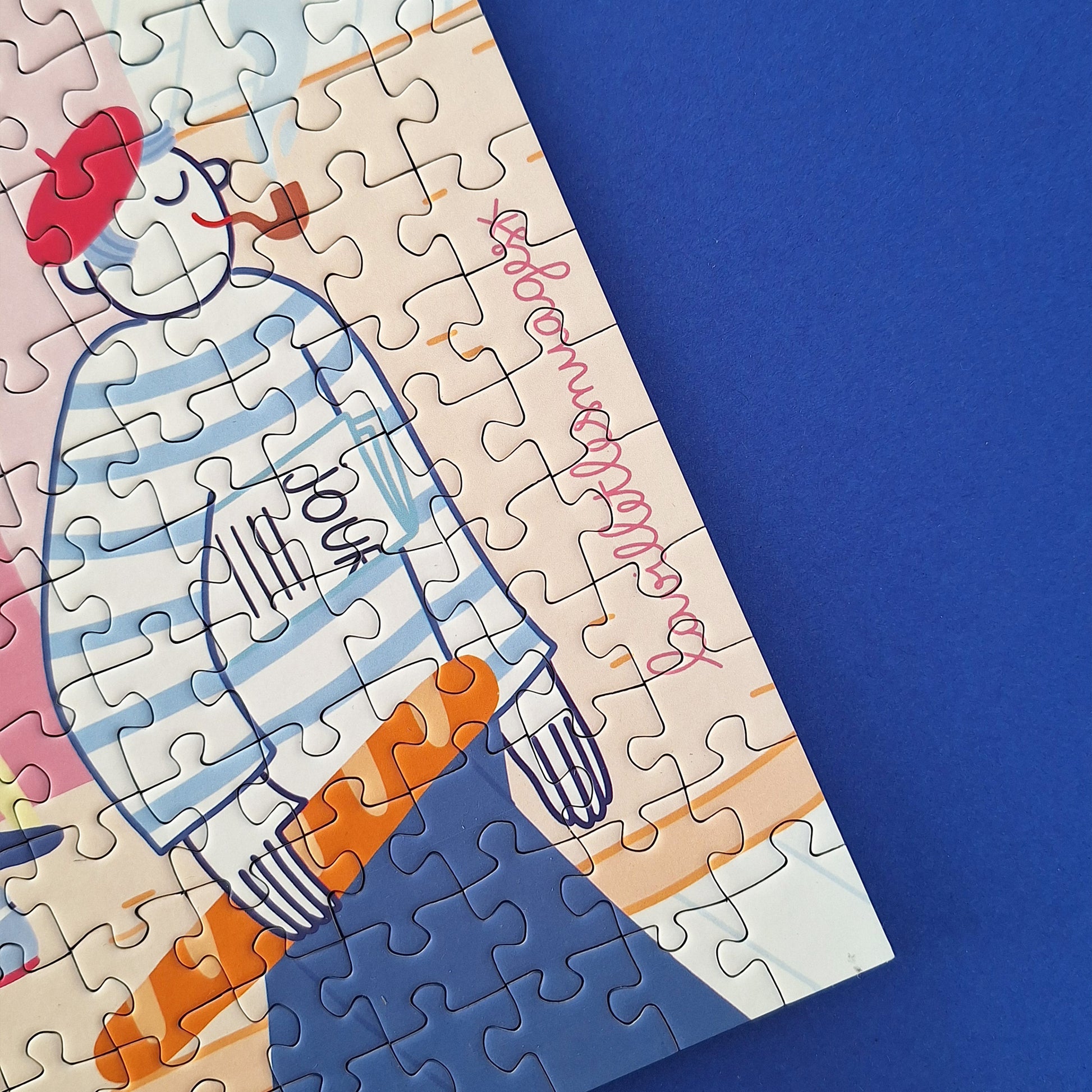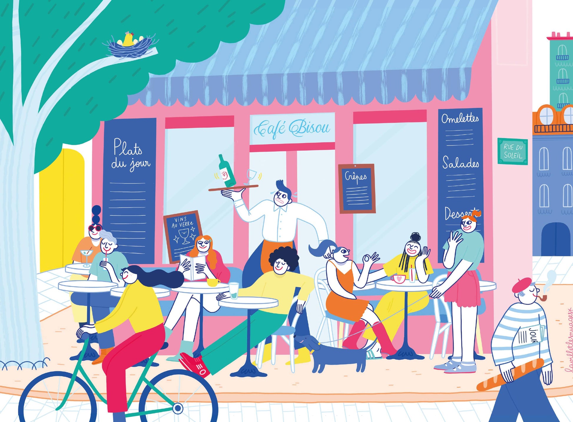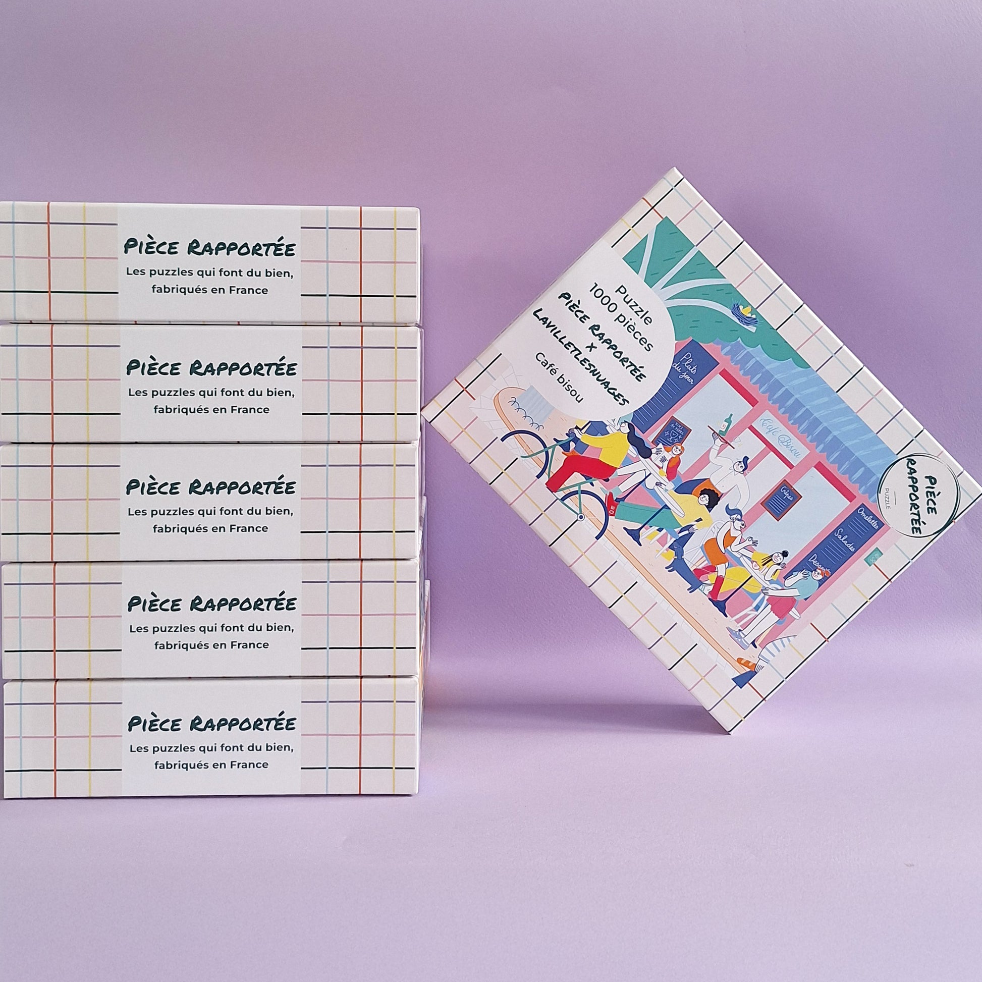 Puzzle 1000 pièces fabriqué en France avec une finition soft touch. Une scène conviviale signée Lavilletlesnuages, où l’on retrouve la douceur d’une terrasse de quartier, le soleil, les discussions entre amis et l’ambiance chaleureuse du café bisou.