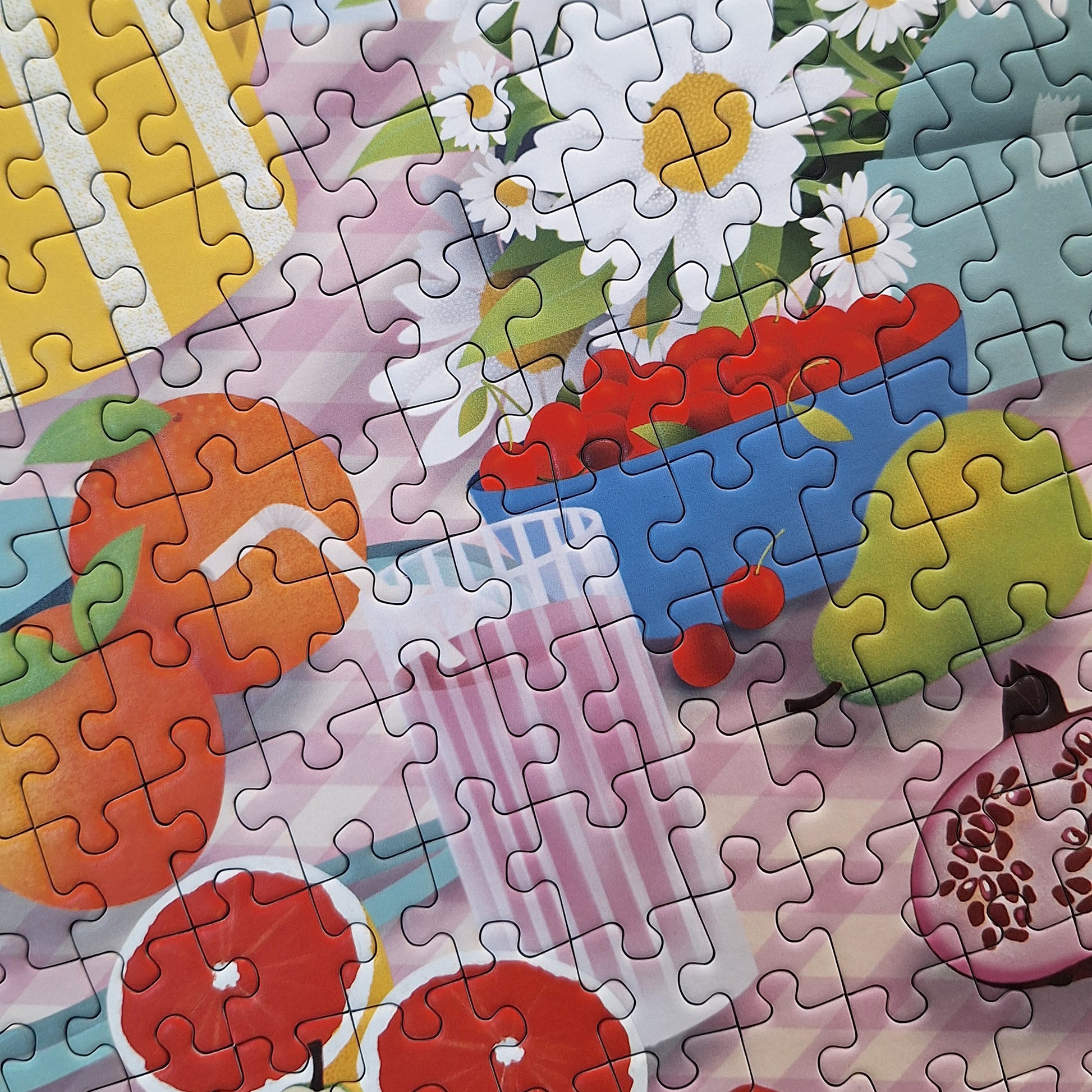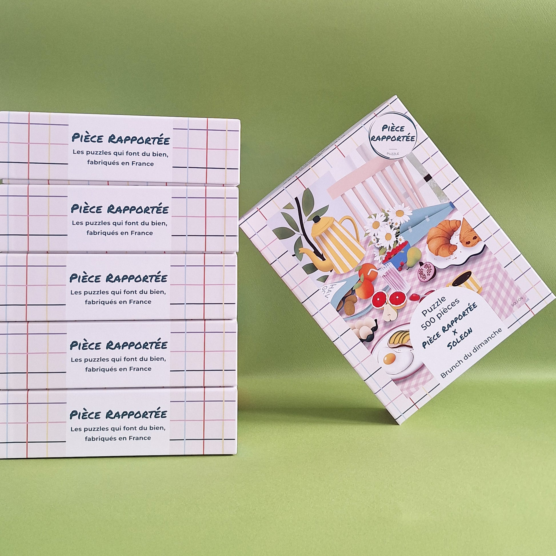 Puzzle 500 pièces fabriqué en France, finition soft touch. Une scène gourmande et réconfortante signée Soléon, inspirée du rituel du brunch du dimanche, parfait pour un moment de détente seul.e ou à plusieurs.